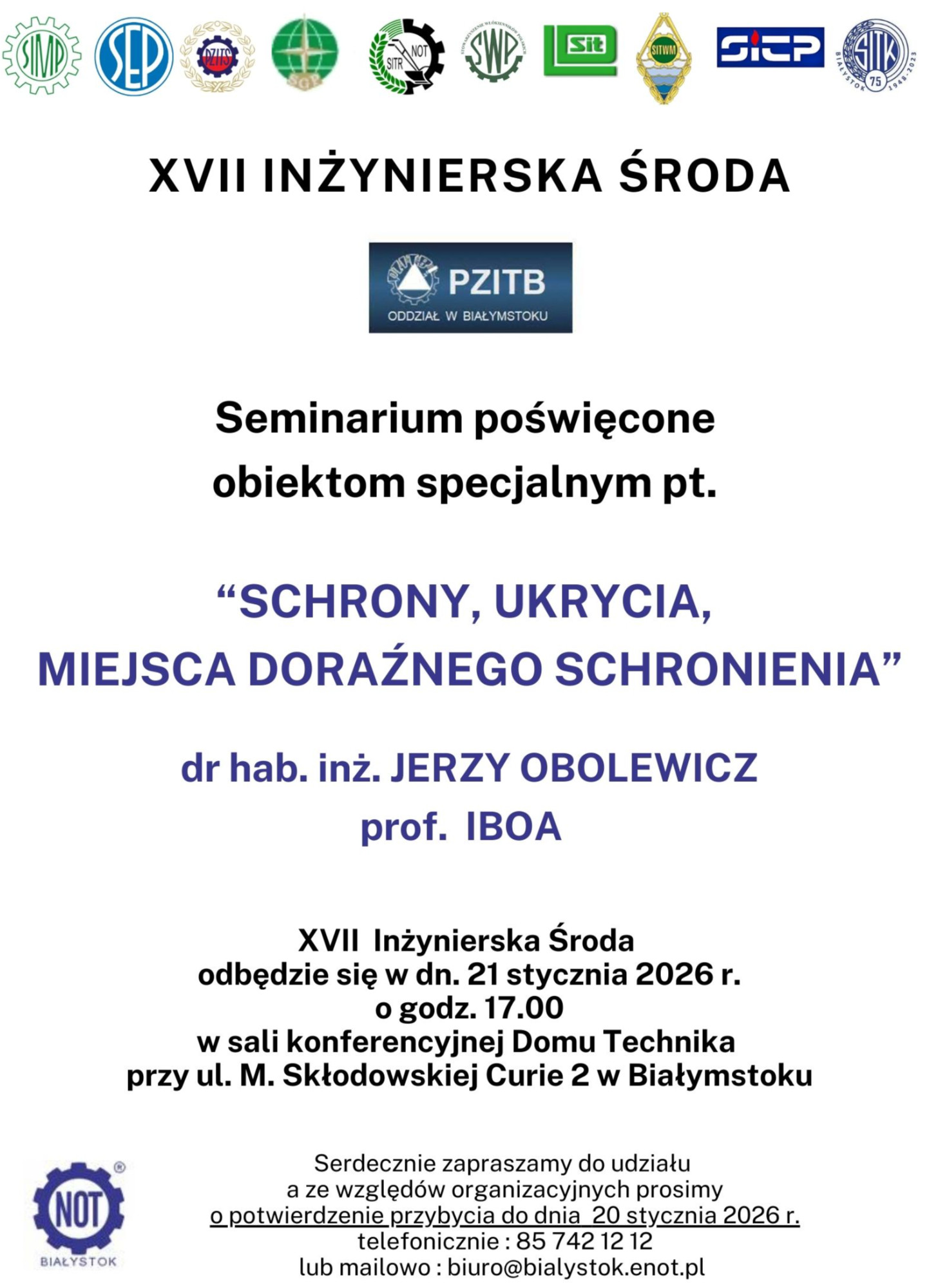 Serdecznie zapraszamy do udziału w pierwszej w tym roku Środzie Inżynierskiej w dn. 21 stycznia 2026 r. Temat wyjątkowo aktualny i ciekawy - "Schrony, ukrycia, miejsca doraźnego schronienia". Wykład przygotował dla Państwa i przedstawi dr hab. inż. Jerzy Obolewicz prof. IBOA, z Polskiego Związku Inżynierów i Techników Budownictwa Oddział w Białymstoku.